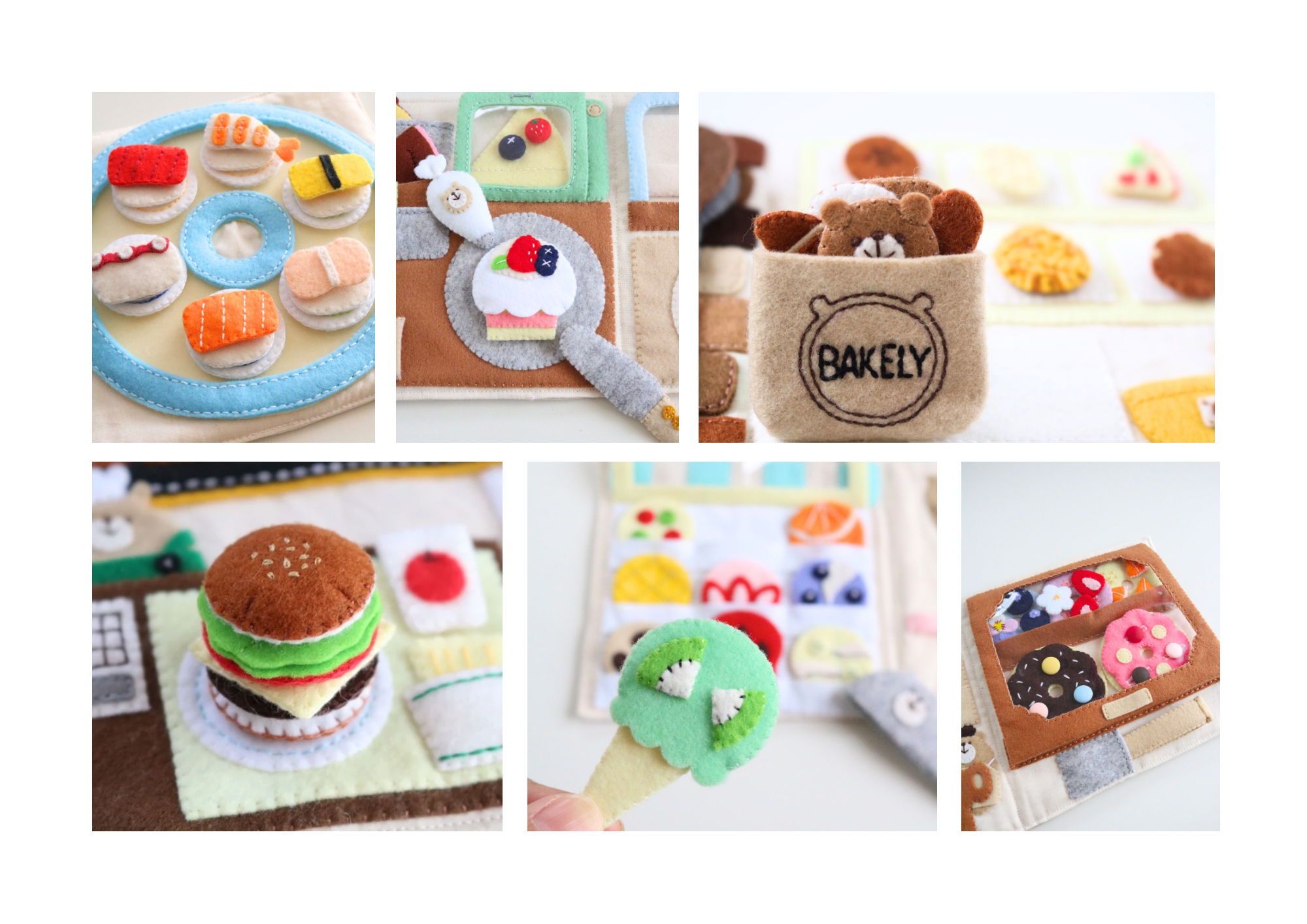 \くまのケーキ屋さん、オープンします!/ かわいくておいしそうな"くまのケーキ屋さん" スポンジを焼いてケーキをデコレーションして、 ショーケースに入れれば、 本物のケーキ屋さんみたい♪ ケーキがたくさん入ったショーケースを眺めながら、 『どのケーキにしようかな♪』とワクワク♡ / 「いらっしゃいませ〜」 「くまさんケーキください!」 \ ケーキ屋さんになりきって、お店屋さんごっこを楽しんでみてくださいね! 三角ケーキにはボタンをはめて、クリームをトッピング! 遊びながらボタンの練習もできちゃいます。 ✤対象年齢:3歳以上 ✤サイズ:縦16×横16㌢ ✤ページ数:2ページ(見開き1ページ)+表紙、裏表紙 ✤使用している素材: フェルト、くるみボタン、刺繍糸、 台紙…キルティング生地、綿オックス生地、PP(ポリプロピレン)板、ppシート、ミシン糸 ✤お手入れについて: フェルトはウォッシャブルフェルトを使用しております。 優しく手洗いをしていただき、形を整えて日陰干しでしっかりと乾かして下さい。 ショーケースにはビニール布を使用しておりますので、強い力でもみ洗いをすると破損の恐れがありますので、ご注意ください。 また、遊んでいるとだんだん毛玉ができてきますので、毛玉取りやハサミで切っていただくと、長く遊んでいただけるかと思います。 ⚠︎パーツは安全面を考慮し、しっかりと縫い付けてありますが、 遊んでいると徐々に傷んでくると思いますので、定期的に取れかかっていないかなどの点検をお願いします。 また、小さいパーツがありますので、お子様の誤飲には十分注意していただきますようお願いいたします。